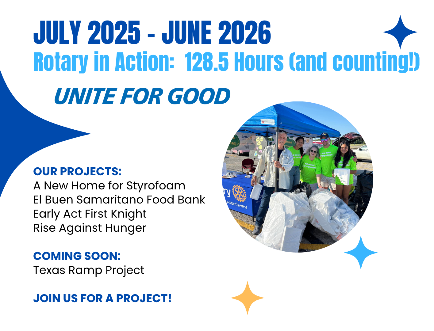The Rotary Club of Austin-Southwest meets at DK Maria's Tex Mex located at 1807 W Slaughter Lane Ste 750, Austin, TX 78748. We meet most Thursdays at noon, have monthly service projects and we have a quarterly social. If you need more information, please contact President Rebekah Goolsby. We Welcome You to our meetings, socials and service projects!